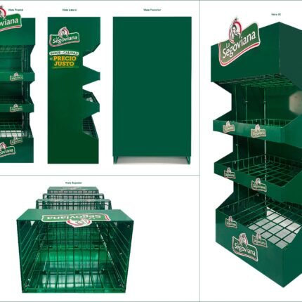 Ganchera exhibidor de atun, hecho en material de alambre de 4mm plastificado en color azul con un parante plegable, la cenefa de poliestireno de 800 micras impresión a full color mas barniz, tiene capacidad para 12 latas. Color de origen.