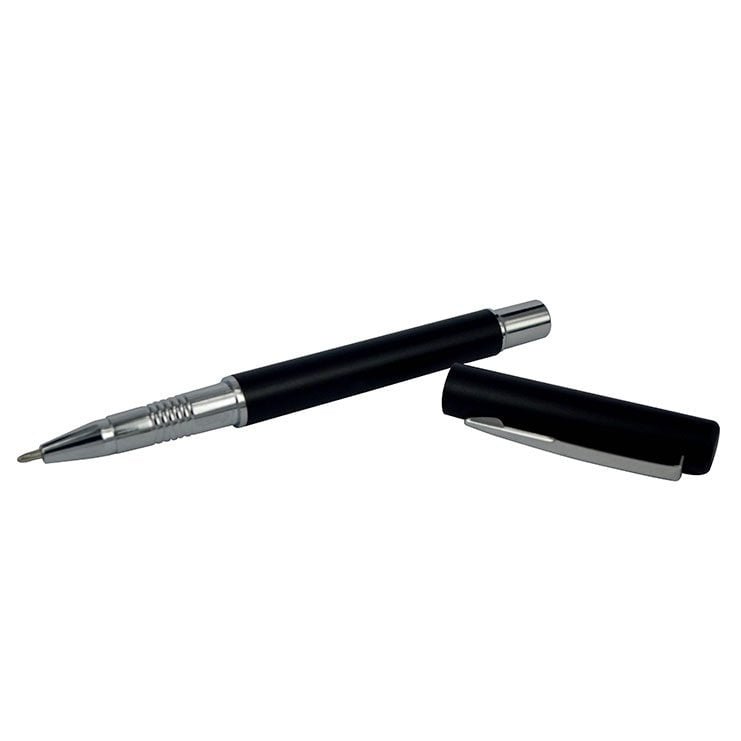 Apariencia metálica lapicero con tapa, tinta líquida color negro. material: plástico. medida: 13.2 cm