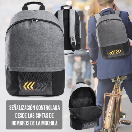 Mochila cargador con panel de carga solar en resistente nylon 1200D. Resistente al agua, con salida USB para carga -powerbank no incluido- y cierre de seguridad con contraseña. Compartimento principal con doble tirador y bolsillo acolchado para laptop o tablet de hasta 10 pulgadas. Cintas de hombros y espalda con acolchado ergonómico.
