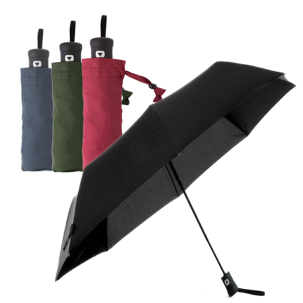 Paraguas plegable de alta calidad de 8 paneles en sobrios colores. De 100cm de diámetro, con apertura automática y en resistente material pongee. Con varillas metálicas en color negro, cierre de velcro y mango ergonómico de EVA con cinta de transporte. Presentado en funda individual a juego con cinta de transporte y cierre con accesorio de ajuste.